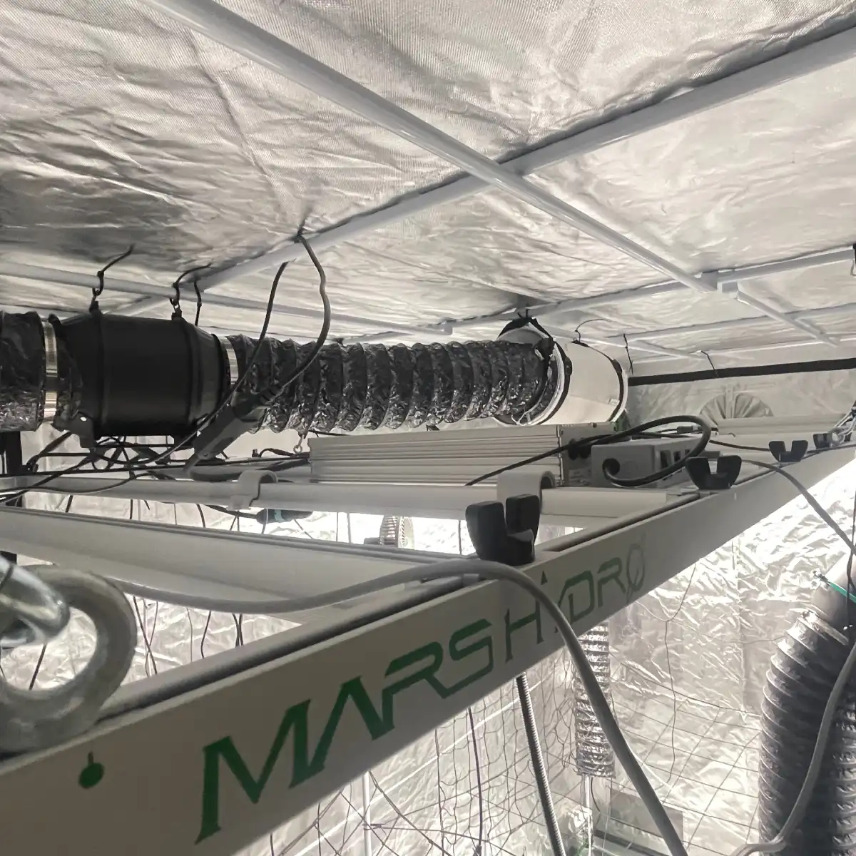 - Mars Hydro Ifresh 6″ ducted from the AC vent to the roof (Same AC wifi controller)