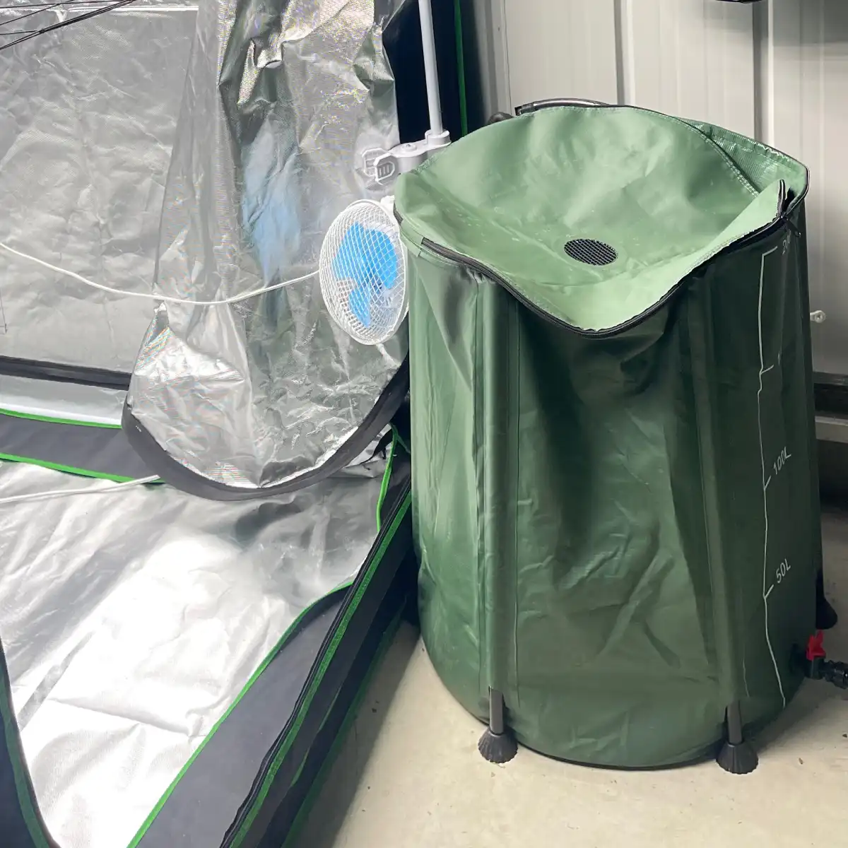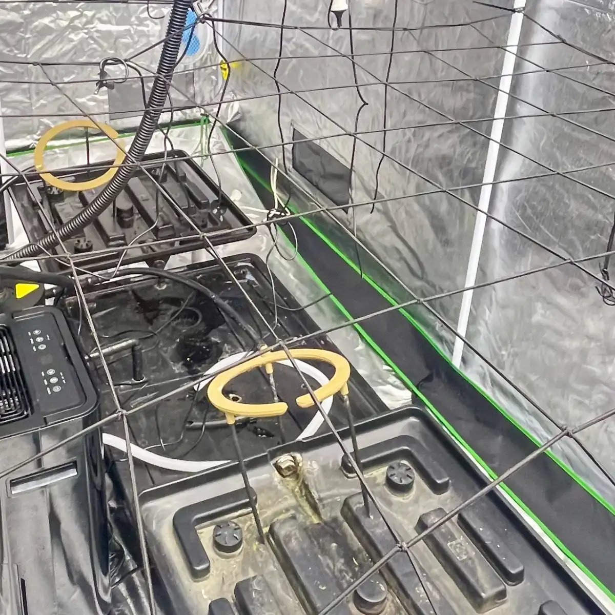 The irrigation system was a closed-loop design running from a 200 L SeaHawk main tank outside the tent and a 65 L internal reservoir. Both pumps were 1100 L/h brushless units with a 5 m head height. Two Bucket Company 22″ stands with extended legs supported the plants, with halo ring feeders ensuring even nutrient delivery. All drainage was captured and recycled automatically.