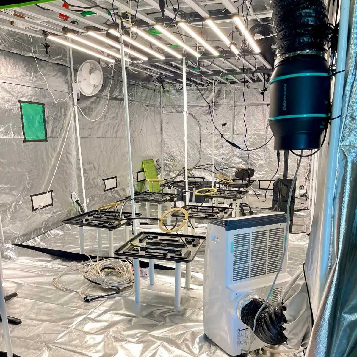 Environment control was completely independent from the rest of the site. Fresh air came through three Mars Hydro iFresh 6″ intake fans with automotive filters, while three Vivosun S6 units and one Mars Hydro 6″ automatic fan handled extraction. Climate was stabilised by an Arlec 16,000 BTU WiFi AC and a 3.5 kW Euromatic portable air conditioner on Grid Connect, supported by a Vivosun H19 intelligent humidifier to keep VPD in range.