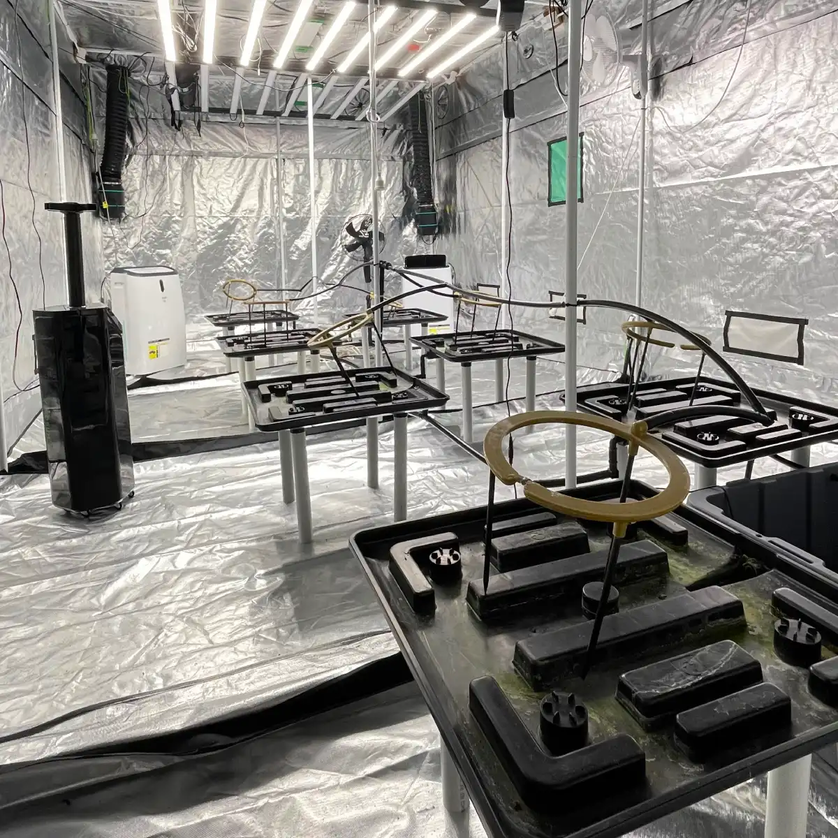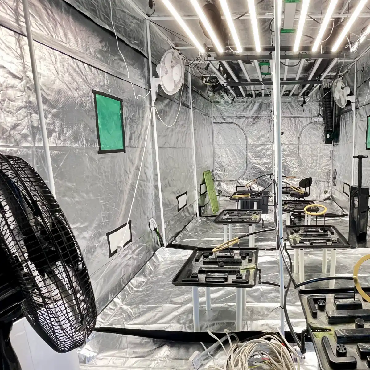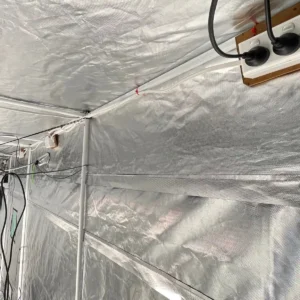 This 6 × 3 × 2.4 m flowering tent was designed as a fully automated, stand-alone system. It ran seven large plants comfortably, with capacity for an eighth if needed. Lighting was provided by four Mars Hydro FC-E1200W fixtures, giving full canopy coverage and enough headroom to push plants hard in late flower.