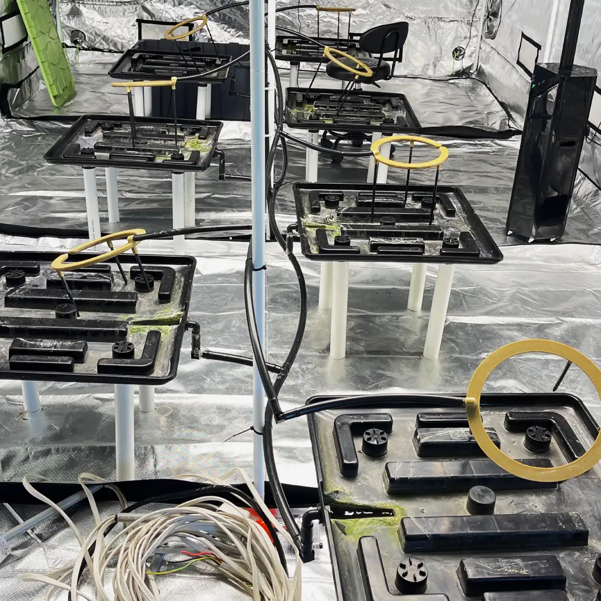 The irrigation system was a closed-loop design built around a 250 L SeaHawk main tank outside the tent and a 100 L internal reservoir. Seven Bucket Company 22″ stands with extended legs sat over the plumbing so runoff could be captured, pumped back, and reused. An AQUAPRO AP3000 managed main flow, with a secondary brushless pump (5 m, 1100 L/h) in the reservoir. Feeding, recycling, and scheduling were all controlled via WiFi, allowing precise monitoring of plant uptake and nutrient use.